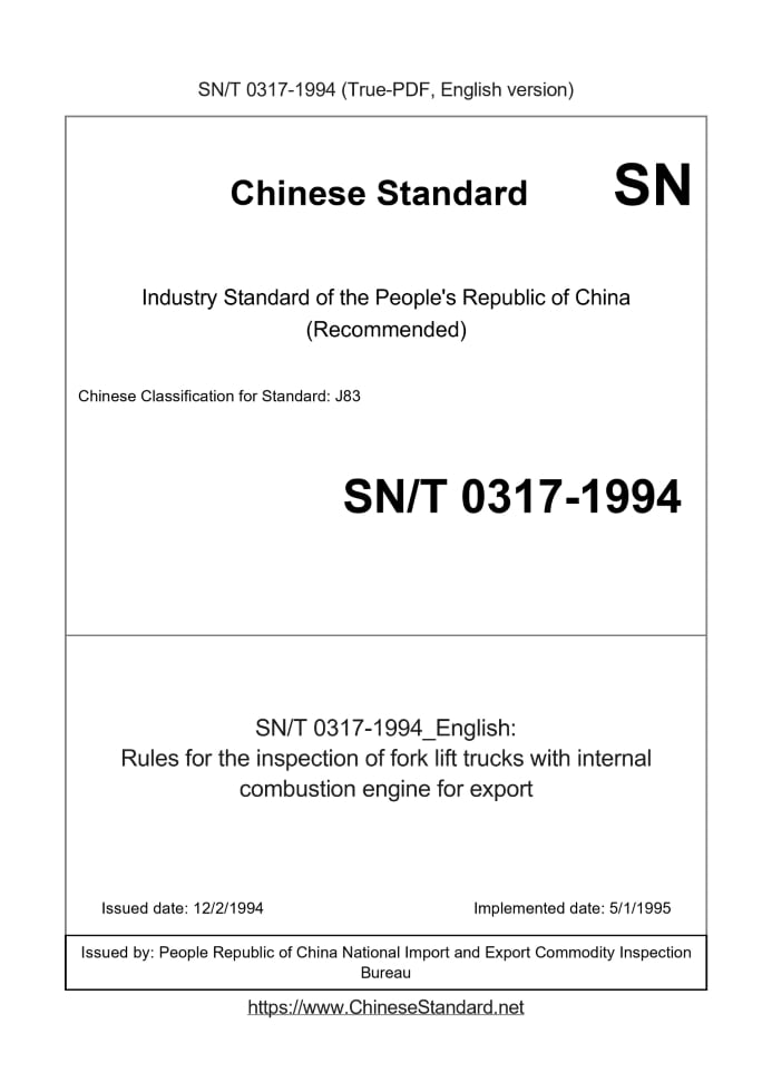 Delivery: <= 3 days. True-PDF full-copy in English will be manually translated and delivered via email. SN/T 0317-1994: Rules for the inspection of fork lift trucks with internal combustion engine for export Status: Obsolete