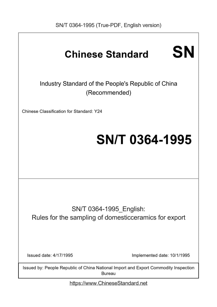 Delivery: <= 3 days. True-PDF full-copy in English will be manually translated and delivered via email. SN/T 0364-1995: Rules for the sampling of domesticceramics for export Status: Obsolete