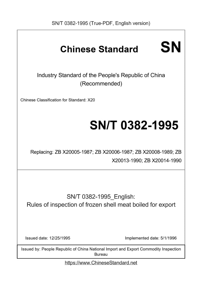 Delivery: <= 2 days. True-PDF full-copy in English will be manually translated and delivered via email. SN/T 0382-1995: Rules of inspection of frozen shell meat boiled for export Status: Obsolete