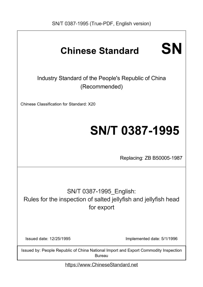 Delivery: <= 2 days. True-PDF full-copy in English will be manually translated and delivered via email. SN/T 0387-1995: Rules for the inspection of salted jellyfish and jellyfish head for export