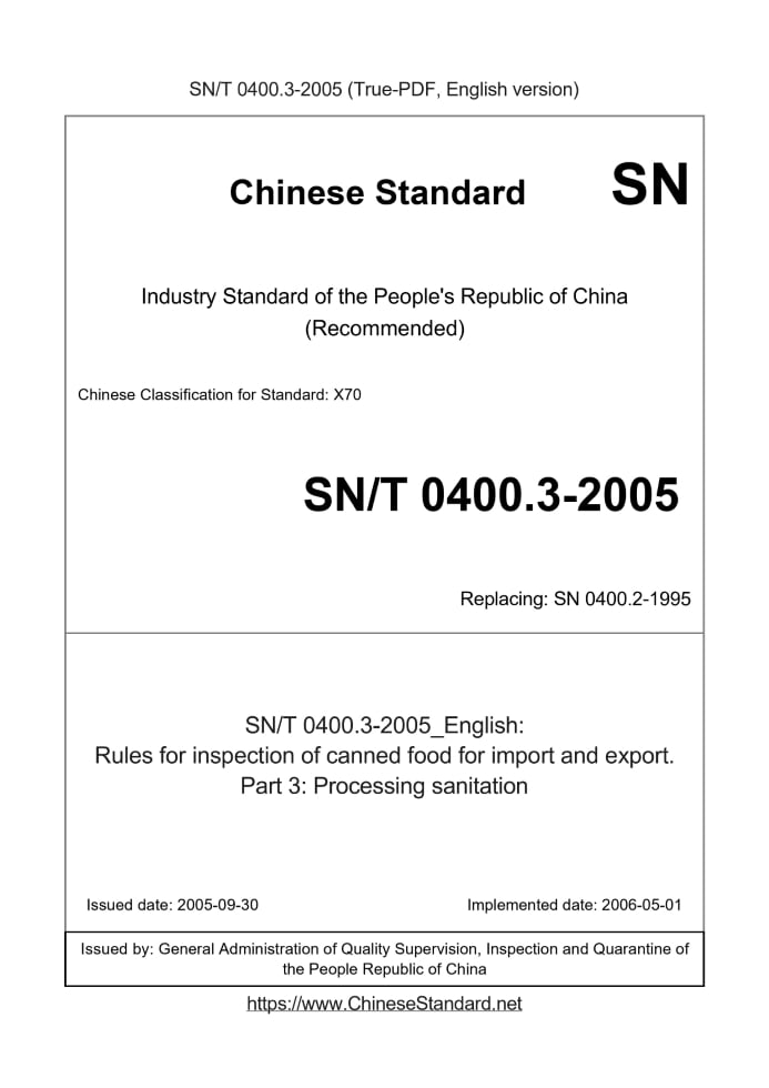 Delivery: <= 3 days. True-PDF full-copy in English will be manually translated and delivered via email. SN/T 0400.3-2005: Rules for inspection of canned food for import and export. Part 3: Processing sanitation Status: Valid SN/T 0400.3: Historical versions