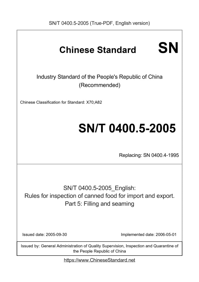 Delivery: <= 3 days. True-PDF full-copy in English will be manually translated and delivered via email. SN/T 0400.5-2005: Rules for inspection of canned food for import and export. Part 5: Filling and seaming Status: Valid SN/T 0400.5: Historical versions