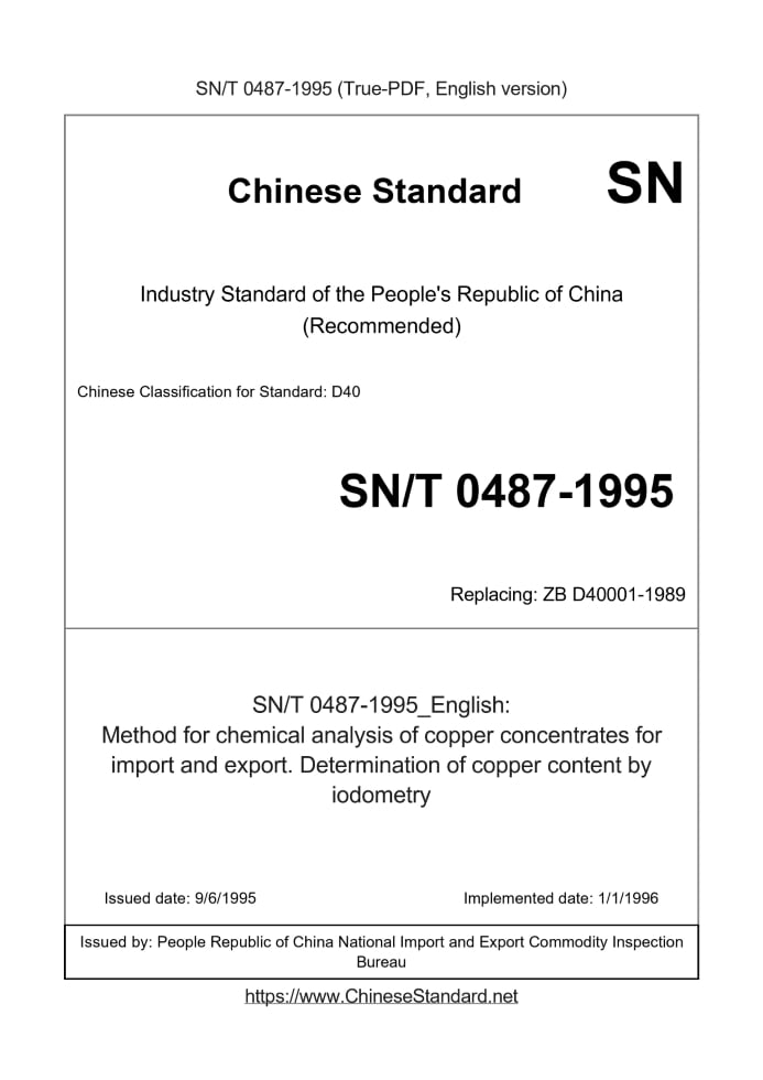 Delivery: <= 2 days. True-PDF full-copy in English will be manually translated and delivered via email. SN/T 0487-1995: Method for chemical analysis of copper concentrates for import and export. Determination of copper content by iodometry Status: Obsolete
