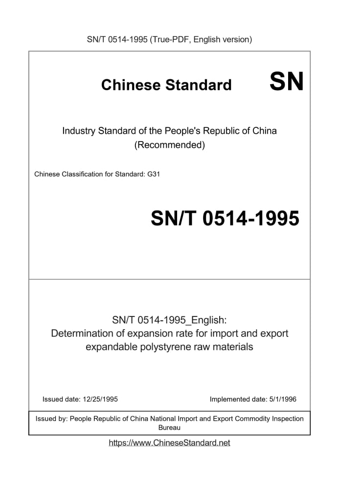 Delivery: <= 3 days. True-PDF full-copy in English will be manually translated and delivered via email. SN/T 0514-1995: Determination of expansion rate for import and export expandable polystyrene raw materials Status: Obsolete