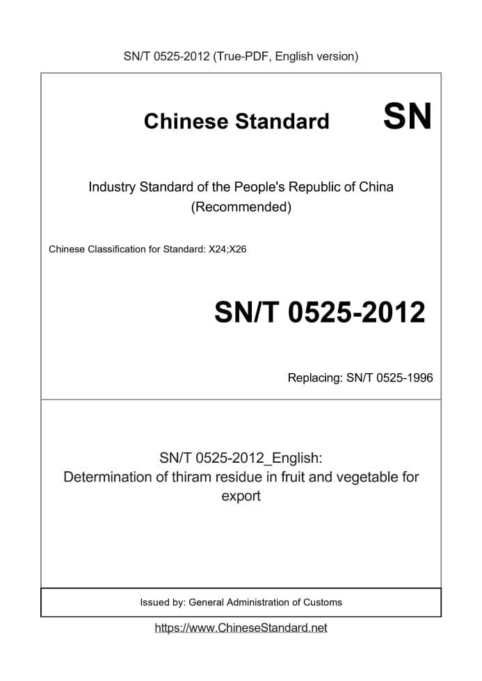 Delivery: <= 5 days. True-PDF full-copy in English will be manually translated and delivered via email. SN/T 0525-2012: Determination of thiram residue in fruit and vegetable for export Status: Valid SN/T 0525: Historical versions