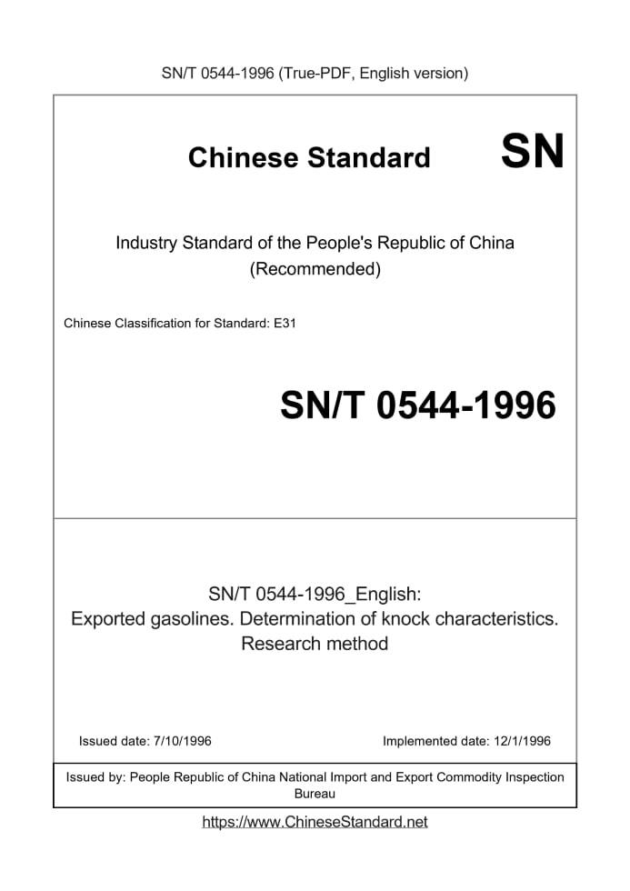 Delivery: <= 4 days. True-PDF full-copy in English will be manually translated and delivered via email. SN/T 0544-1996: Exported gasolines. Determination of knock characteristics. Research method Status: Obsolete