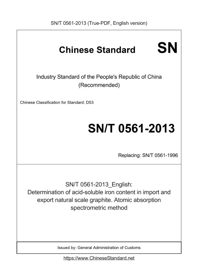 Delivery: <= 3 days. True-PDF full-copy in English will be manually translated and delivered via email. SN/T 0561-2013: Determination of acid-soluble iron content in import and export natural scale graphite. Atomic absorption spectrometric method Status: Valid SN/T 0561: Historical versions