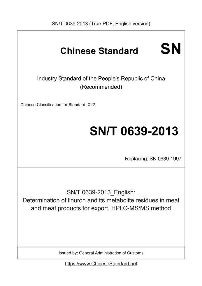 Determination of linuron and its metabolite residues in meat and meat products for export.HPLC-MS/MS method People's Republic of China Entry-Exit Inspection and Quarantine Standards Replacing SN 0639-1997 Exports of meat and meat products linuron and its metabolite Detection of Residual Liquid chromatography - mass spectrometry/mass spectrometry HPLC-MS/MSmethod Issued on. 2013-08-30 2014-03-01 implementation People's Republic of China The State Administration of Quality Supervision, Inspection and Quarantine released