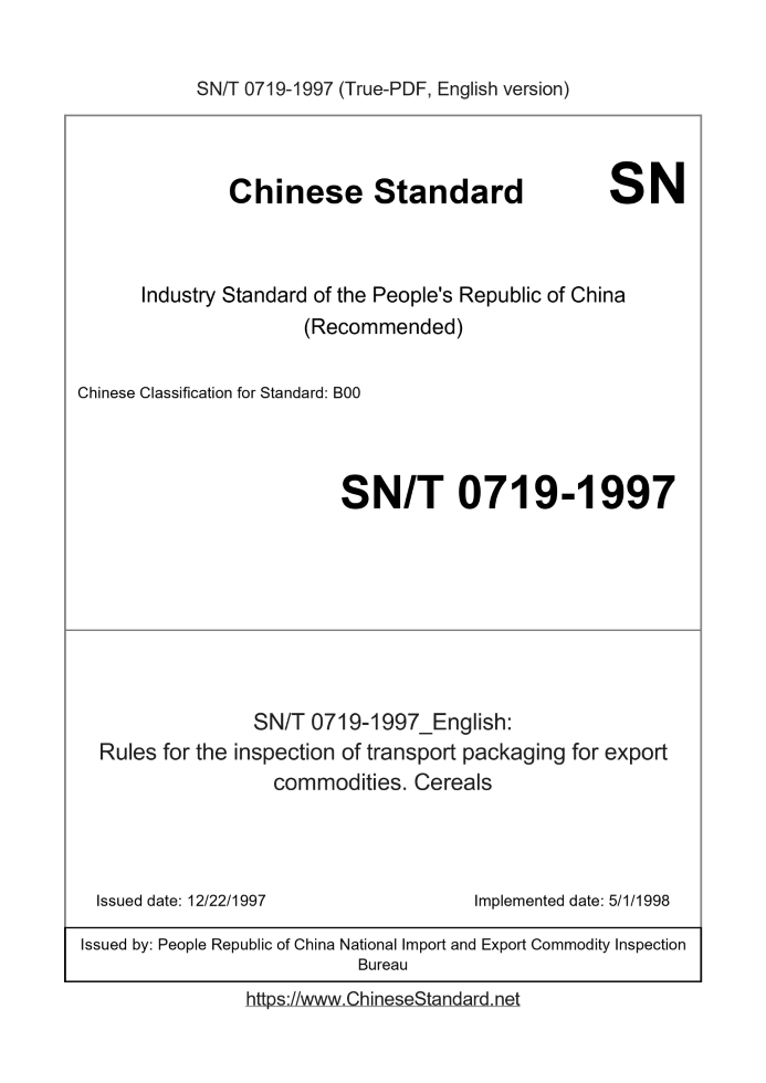 | SN/T 0719-1997 | English | 489 | Add to Cart | 3 days [Need to translate] | Rules for the inspection of transport packaging for export commodities. Cereals |
