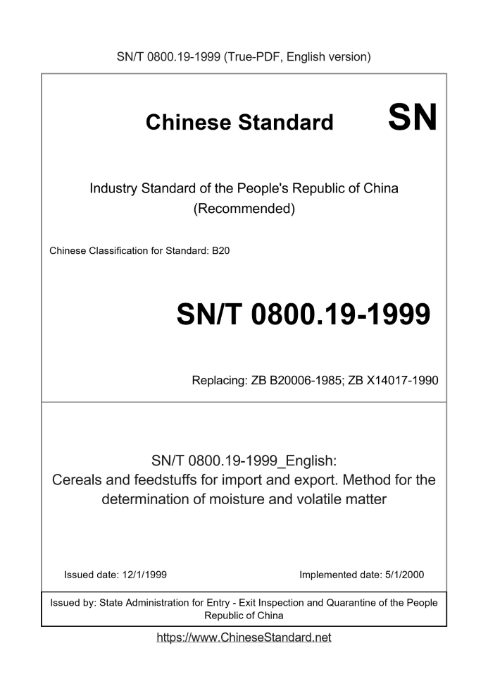Delivery: <= 2 days. True-PDF full-copy in English will be manually translated and delivered via email. SN/T 0800.19-1999: Cereals and feedstuffs for import and export. Method for the determination of moisture and volatile matter Status: Obsolete