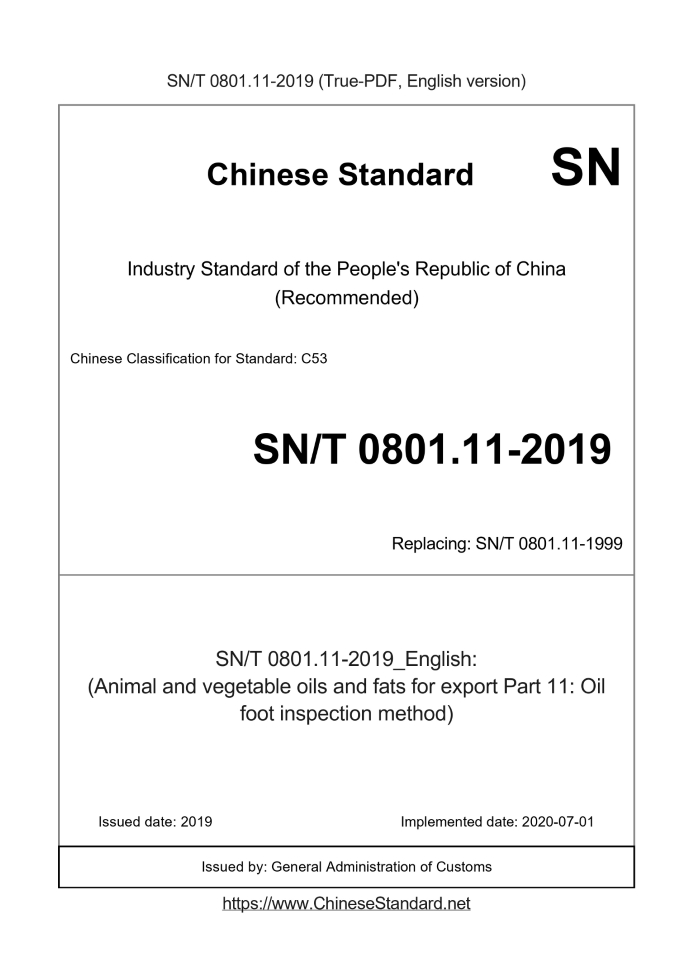 Delivery: <= 3 days. True-PDF full-copy in English will be manually translated and delivered via email. SN/T 0801.11-2019: (Animal and vegetable oils and fats for export Part 11: Oil foot inspection method) Status: Valid SN/T 0801.11: Historical versions