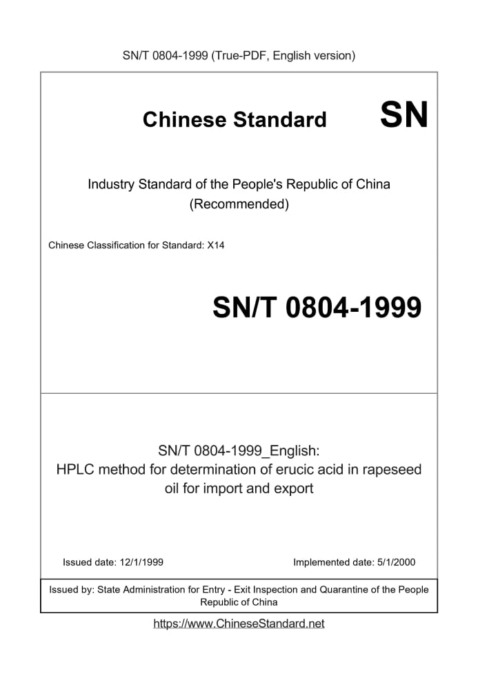 Delivery: <= 3 days. True-PDF full-copy in English will be manually translated and delivered via email. SN/T 0804-1999: HPLC method for determination of erucic acid in rapeseed oil for import and export Status: Obsolete