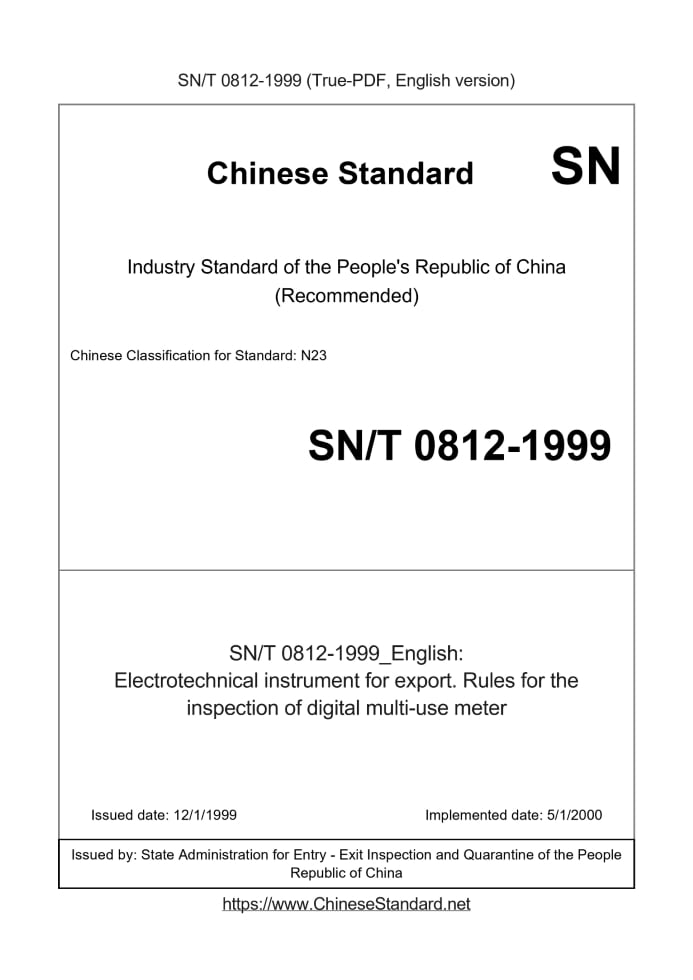 Delivery: <= 2 days. True-PDF full-copy in English will be manually translated and delivered via email. SN/T 0812-1999: Electrotechnical instrument for export. Rules for the inspection of digital multi-use meter Status: Obsolete