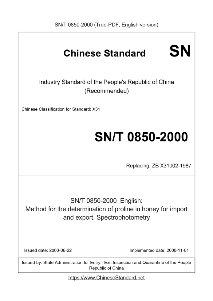 Delivery: <= 2 days. True-PDF full-copy in English will be manually translated and delivered via email. SN/T 0850-2000: Method for the determination of proline in honey for import and export. Spectrophotometry Status: Obsolete
