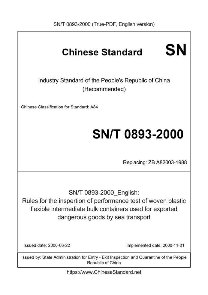 Delivery: <= 3 days. True-PDF full-copy in English will be manually translated and delivered via email. SN/T 0893-2000: Rules for the inspertion of performance test of woven plastic flexible intermediate bulk containers used for exported dangerous goods by sea transport