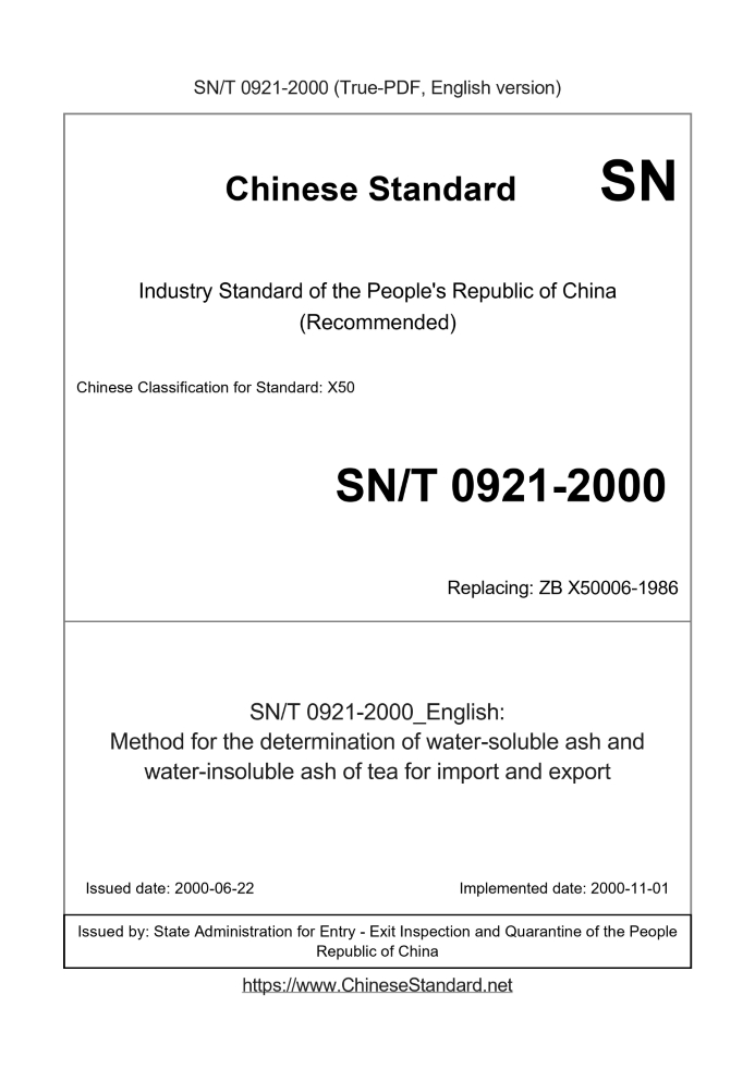 Delivery: <= 2 days. True-PDF full-copy in English will be manually translated and delivered via email. SN/T 0921-2000: Method for the determination of water-soluble ash and water-insoluble ash of tea for import and export Status: Obsolete