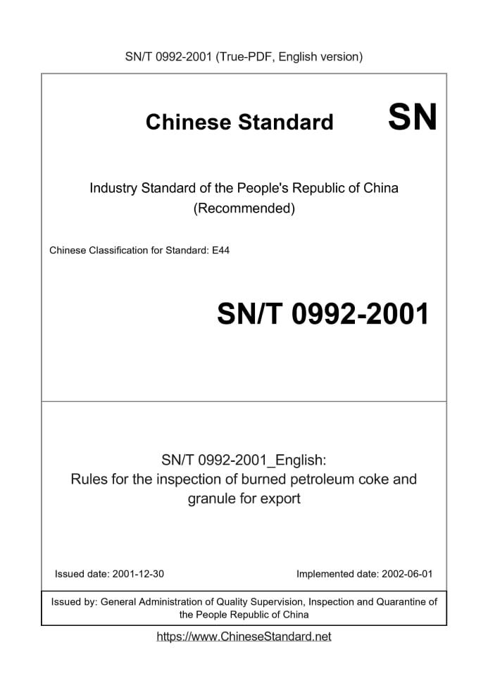 Delivery: <= 3 days. True-PDF full-copy in English will be manually translated and delivered via email. SN/T 0992-2001: Rules for the inspection of burned petroleum coke and granule for export Status: Obsolete