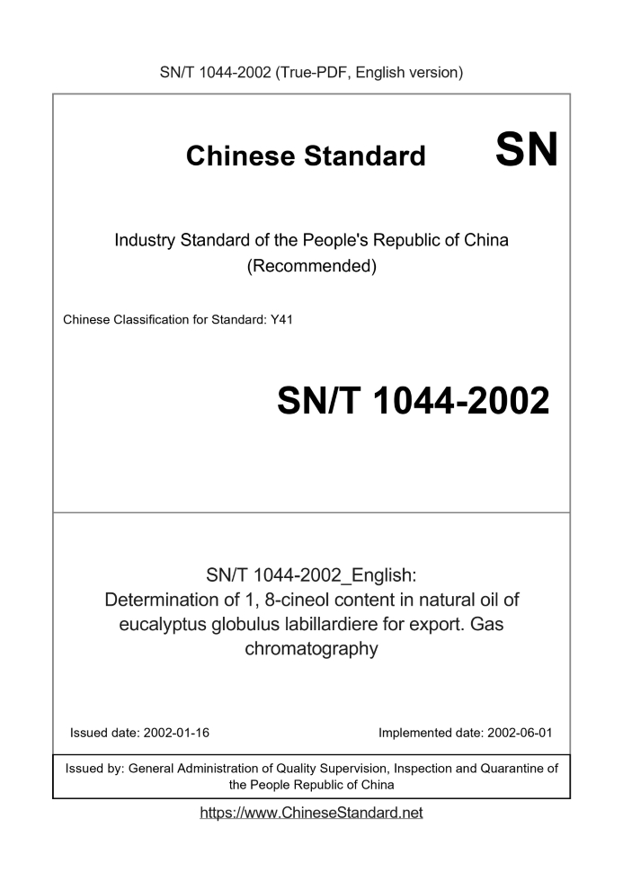Delivery: <= 3 days. True-PDF full-copy in English will be manually translated and delivered via email. SN/T 1044-2002: Determination of 1, 8-cineol content in natural oil of eucalyptus globulus labillardiere for export. Gas chromatography Status: Valid