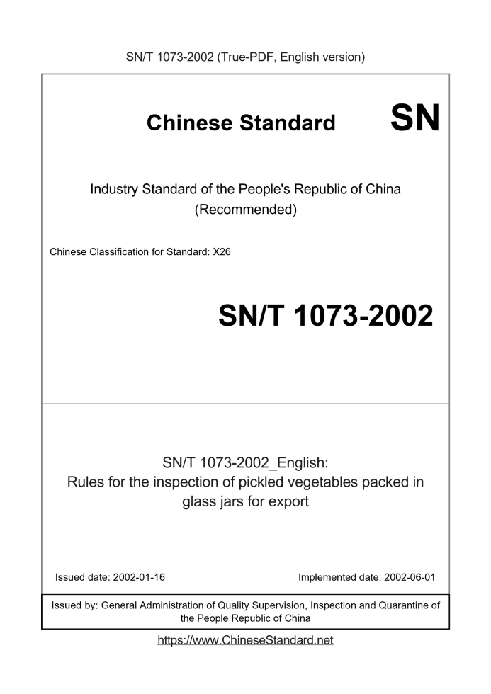 Delivery: <= 3 days. True-PDF full-copy in English will be manually translated and delivered via email. SN/T 1073-2002: Rules for the inspection of pickled vegetables packed in glass jars for export Status: Obsolete