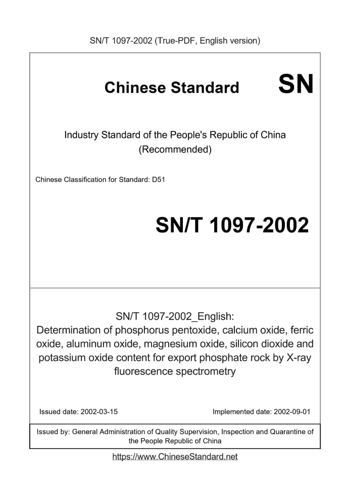 Delivery: <= 3 days. True-PDF full-copy in English will be manually translated and delivered via email. SN/T 1097-2002: Determination of phosphorus pentoxide, calcium oxide, ferric oxide, aluminum oxide, magnesium oxide, silicon dioxide and potassium oxide content for export phosphate rock by X-ray fluorescence spectrometry Status: Valid