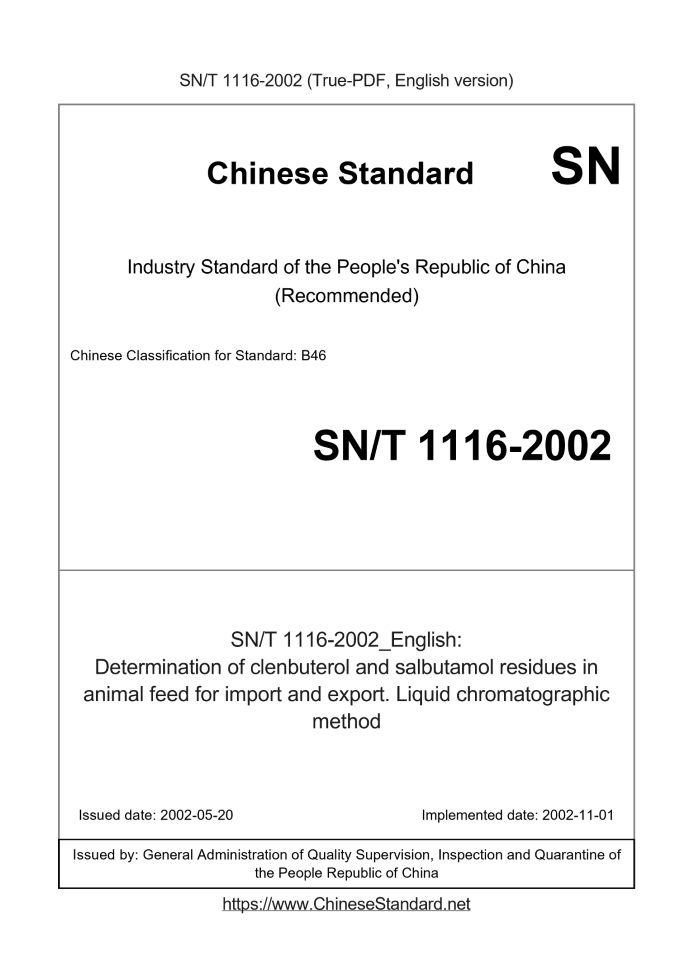 Delivery: <= 3 days. True-PDF full-copy in English will be manually translated and delivered via email. SN/T 1116-2002: Determination of clenbuterol and salbutamol residues in animal feed for import and export. Liquid chromatographic method Status: Valid