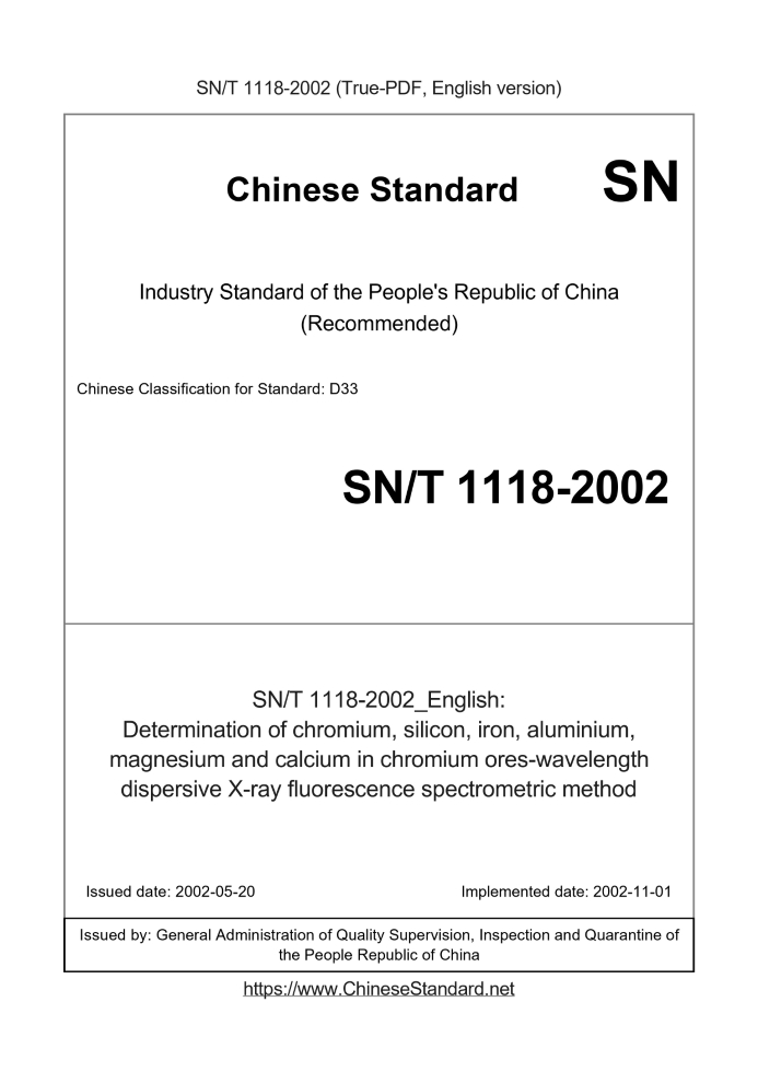 Delivery: <= 3 days. True-PDF full-copy in English will be manually translated and delivered via email. SN/T 1118-2002: Determination of chromium, silicon, iron, aluminium, magnesium and calcium in chromium ores-wavelength dispersive X-ray fluorescence spectrometric method Status: Valid