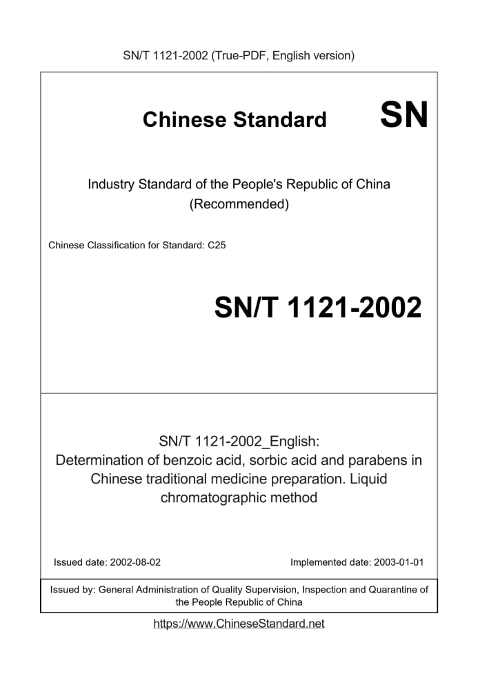 Delivery: <= 3 days. True-PDF full-copy in English will be manually translated and delivered via email. SN/T 1121-2002: Determination of benzoic acid, sorbic acid and parabens in Chinese traditional medicine preparation. Liquid chromatographic method Status: Obsolete