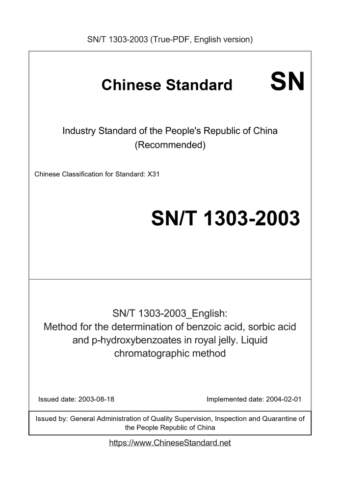 Delivery: <= 3 days. True-PDF full-copy in English will be manually translated and delivered via email. SN/T 1303-2003: Method for the determination of benzoic acid, sorbic acid and p-hydroxybenzoates in royal jelly. Liquid chromatographic method Status: Valid