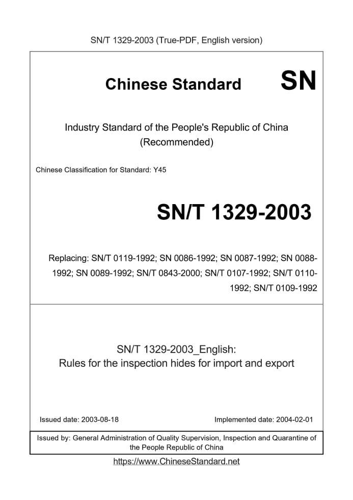 Delivery: <= 3 days. True-PDF full-copy in English will be manually translated and delivered via email. SN/T 1329-2003: Rules for the inspection hides for import and export Status: Obsolete