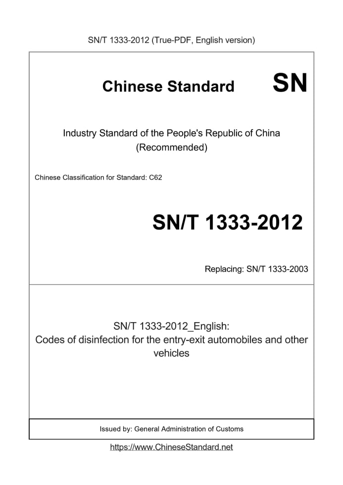 Delivery: <= 3 days. True-PDF full-copy in English will be manually translated and delivered via email. SN/T 1333-2012: Codes of disinfection for the entry-exit automobiles and other vehicles Status: Valid SN/T 1333: Historical versions