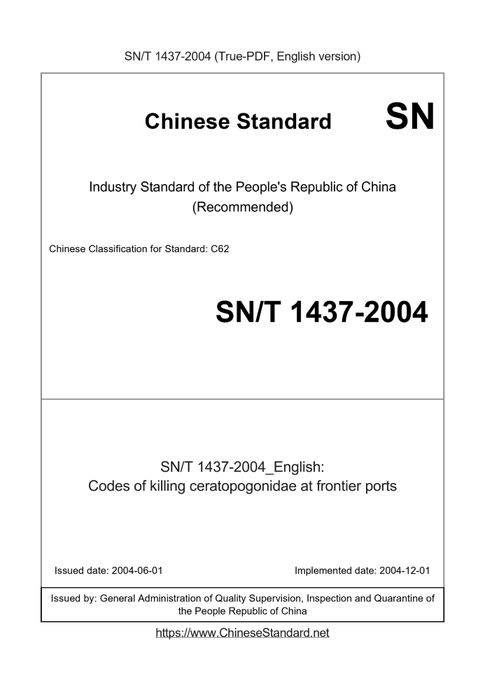 Delivery: <= 3 days. True-PDF full-copy in English will be manually translated and delivered via email. SN/T 1437-2004: Codes of killing ceratopogonidae at frontier ports Status: Valid