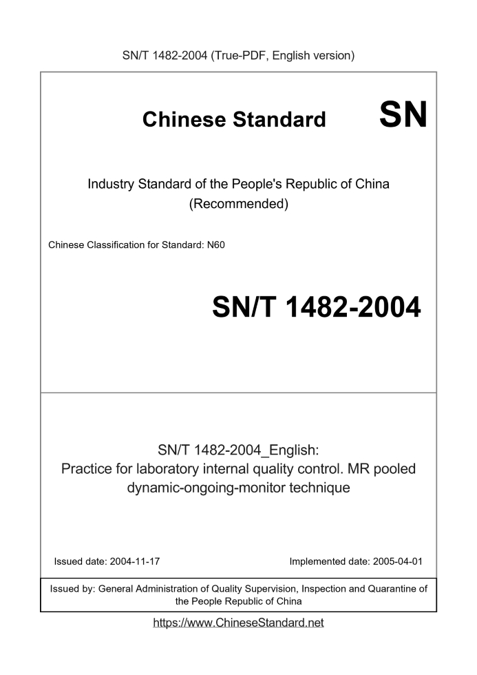 Delivery: <= 5 days. True-PDF full-copy in English will be manually translated and delivered via email. SN/T 1482-2004: Practice for laboratory internal quality control. MR pooled dynamic-ongoing-monitor technique Status: Valid
