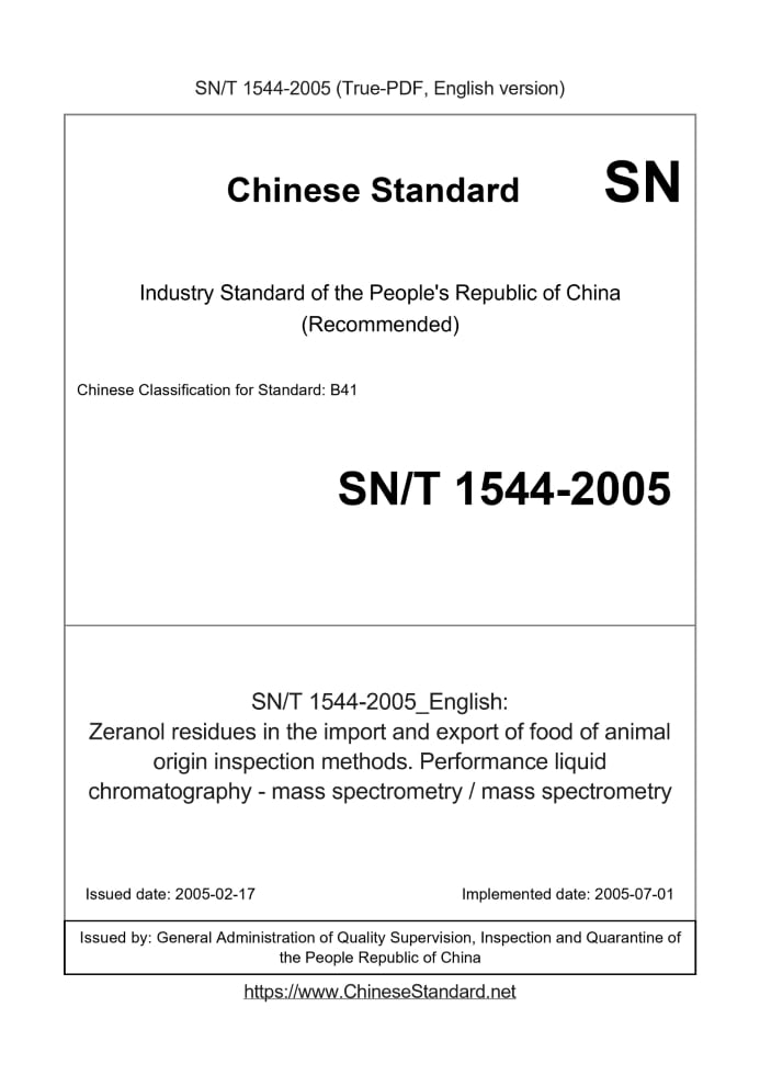 Delivery: <= 4 days. True-PDF full-copy in English will be manually translated and delivered via email. SN/T 1544-2005: Zeranol residues in the import and export of food of animal origin inspection methods. Performance liquid chromatography - mass spectrometry / mass spectrometry Status: Obsolete