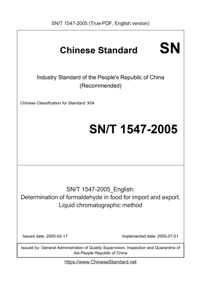 Delivery: <= 3 days. True-PDF full-copy in English will be manually translated and delivered via email. SN/T 1547-2005: Determination of formaldehyde in food for import and export. Liquid chromatographic method Status: Obsolete