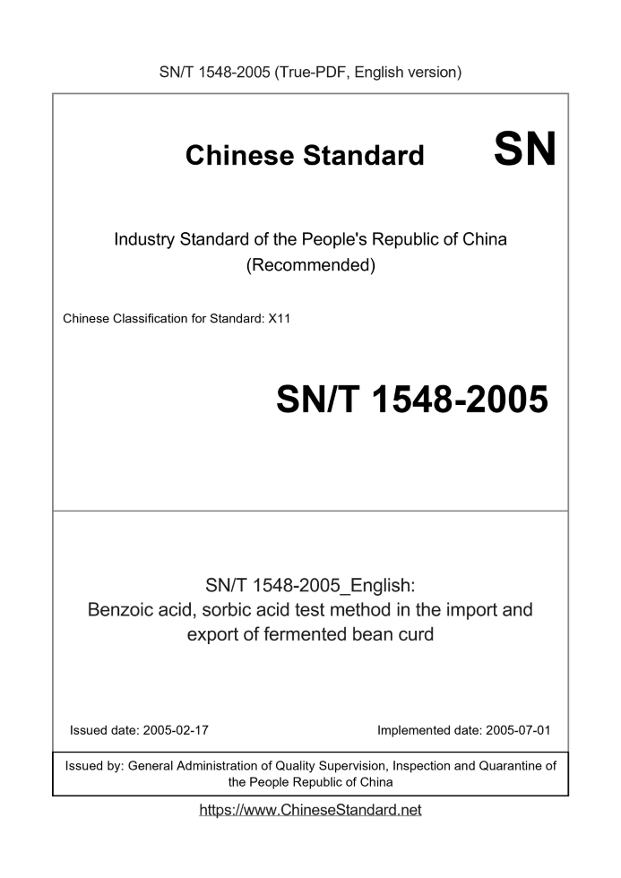 Delivery: <= 3 days. True-PDF full-copy in English will be manually translated and delivered via email. SN/T 1548-2005: Benzoic acid, sorbic acid test method in the import and export of fermented bean curd Status: Obsolete