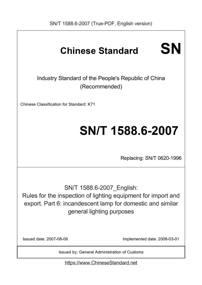 Basic dataStandard ID: SN/T 1588.6-2007 (SN/T1588.6-2007)Description (Translated English): Rules for the inspection of lighting equipment for import and export. Part 6: incandescent lamp for domestic and similar general lighting purposes Sector / Industry: Commodity Inspection Standard (Recommended) Classification of Chinese Standard: K71 Classification of International Standard: 29.140.20 Word Count Estimation: 8,853 Date of Issue: 2007-08-06 Date of Implementation: 2008-03-01 Older Standard (superseded by this standard): SN/T 0620-1996 Quoted Standard: GB/T 2828.1-2003; GB 14196.1-2002; GB 14196.2-2002; SN/T 0002 Regulation (derived from): Accredidation-Technology-Letter [2015] No. 247 Issuing agency(ies): General Administration of Customs Summary: This standard specifies the import and export of domestic and similar general lighting incandescent requirements, sampling, inspection and test results to determine. This standard applies to the following characteristics of the light bulb rated power of 250 W or less (incandescent only 200W and below), rated voltage is 50 V ~ 250 V between (including 50V, 250V), Bolivia shell as A, B, C, G, M, P, PS, PAR, R-shaped, or other shapes with the same purpose of the bulb, a variety of surface-treated glass bulb, Base is: B15d, B22d, E12, E14, E17, E26, E26d, E26/50X39, E27 or/51X39. This section also applies to other shapes with the same purpose and lamp bulbs and bulb including those not directly replace the traditional incandescent light, but the purpose is the same, with the same single-ended halogen ratings. SN/T 1588.6-2007: Rules for the inspection of lighting equipment for import and export. Part 6: incandescent lamp for domestic and similar general lighting purposes---This is a DRAFT version for illustration, not a final translation. Full copy of true-PDF in English version (including equations, symbols, images, flow-chart, tables, and figures etc.) will be manually/carefully translated upon your order. Rules for the inspection of lighting equipment for import and export.Part 6. incandescent lamp for domestic and similar general lighting purposes Exit inspection and quarantine industry standard book People's Republic of China Instead of the SN/T 0620-1996 Inspection of import and export lamps Part 6. Family and similar general Incandescent lighting Posted 2007-08-06 2008-03-01 implementation People's Republic of China The State Administration of Quality Supervision, Inspection and Quarantine released ForewordSN/T 1588 "Importers lighting for the inspection" is divided into nine sections. --- Part 1. heat lamps heat test test light source; --- Part 2. General requirements; --- Part 3. Particular requirements for swimming pools and similar lamps used; --- Part 4. festive lighting; --- Part 5. double capped fluorescent lamps; --- Part 6. domestic and similar general lighting incandescent; --- Part 7. Cartridges bayonet; --- Part 8. ballasts for fluorescent lamps; --- Part 9. fluorescent starter. SN/T 1588 This section of the "import and export inspection of lamps" in Section 6. The partial replacement of SN/T 0620-1996 "export inspection of ordinary light bulbs." This section compared with the SN/T 0620-1996 The main changes are as follows. --- Name of the standard, there are significant changes to the scope of application; --- Preparation for the inspection in accordance with the framework of SN/T 0002-2004 specified; --- Increasing the overall requirements of the inspection procedures; --- Increased inspection and supervision mode. This section proposed and managed by the National Certification and Accreditation Administration Committee. This section was drafted by. People's Republic of China, Xiamen CIQ. The main drafters of this section. Huang Min, Yan Weimin, Wang Qu Bo, Lan Xu. This section first release of exit inspection and quarantine industry standards, instead of following industry standards from the implementation date. --- SN/T 0620-1996.Introduction"Inspection of import and export lamps - Part 6. Family and similar general lighting incandescent lamp" is the import and export for domestic and similar Ordinary incandescent lighting inspection work in accordance with the import and export for domestic and similar general lighting incandescent inspection play a guiding and normative effect. With China's accession to the World Trade Organization (WTO) and the revised "People's Republic of China Import and Export Commodity Inspection Law" Import and Export Commodity Inspection Test mode has undergone great changes, and changes in order to adapt to the situation, the state department in charge of inspection and quarantine inspection and quarantine standards organization established system. This part belongs to the standard system of inspection and quarantine fourth floor --- personality criteria for the characteristics of lighting equipment, import and export provisions of the Family and class Particular requirements for general lighting incandescent-like test. Inspection of import and export lamps Part 6. Family and similar general Incandescent lighting1 ScopeSN/T 1588 provisions of this part of the import and export for domestic and similar general lighting incandescent requirements, sampling, testing and inspection The results of the determination. This section applies to the bulb with the following characteristics. --- Rated at 250W or less (incandescent light only 200W and below); --- Rated voltage is (including 50V, 250V) between 50V ~ 250V; --- Bulb as A, B, C, G, M, P, PS, PAR, R-shaped, or other shapes with the same purpose of the bulb; --- Various surface-treated glass bulb; --- Lamp is. B15d, B22d, E12, E14, E17, E26, E26d, E26/50X39, E27 or E27/51X39. This section is also applicable to other shapes and bulb lamp bulb has the same purpose as well, including those not directly replace the traditional tungsten filament Light, but the same purpose, the same rating as the above-mentioned single-ended halogen.2 Normative reference