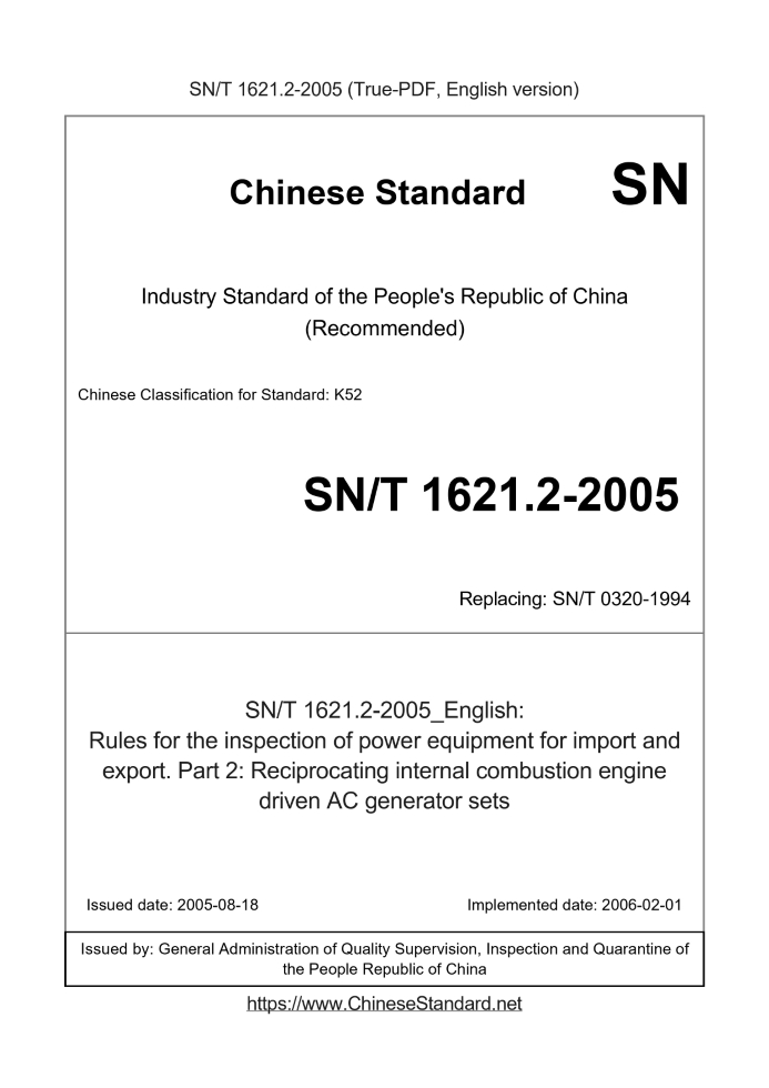 Delivery: <= 3 days. True-PDF full-copy in English will be manually translated and delivered via email. SN/T 1621.2-2005: Rules for the inspection of power equipment for import and export. Part 2: Reciprocating internal combustion engine driven AC generator sets Status: Valid