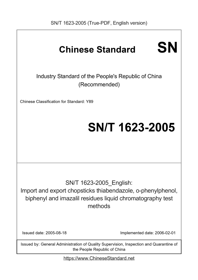 Delivery: <= 4 days. True-PDF full-copy in English will be manually translated and delivered via email. SN/T 1623-2005: Import and export chopsticks thiabendazole, o-phenylphenol, biphenyl and imazalil residues liquid chromatography test methods Status: Obsolete