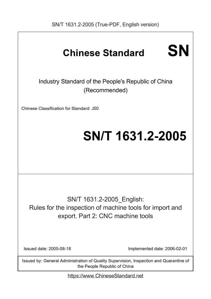 Delivery: <= 3 days. True-PDF full-copy in English will be manually translated and delivered via email. SN/T 1631.2-2005: Rules for the inspection of machine tools for import and export. Part 2: CNC machine tools Status: Valid
