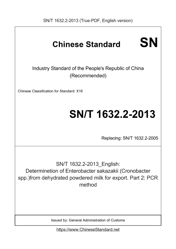 Delivery: <= 3 days. True-PDF full-copy in English will be manually translated and delivered via email. SN/T 1632.2-2013: Determinetion of Enterobacter sakazakii (Cronobacter spp.)from dehydrated powdered milk for export. Part 2: PCR method Status: Valid SN/T 1632.2: Historical versions