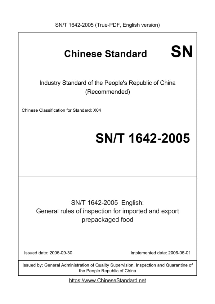 Delivery: <= 3 days. True-PDF full-copy in English will be manually translated and delivered via email. SN/T 1642-2005: General rules of inspection for imported and export prepackaged food Status: Valid