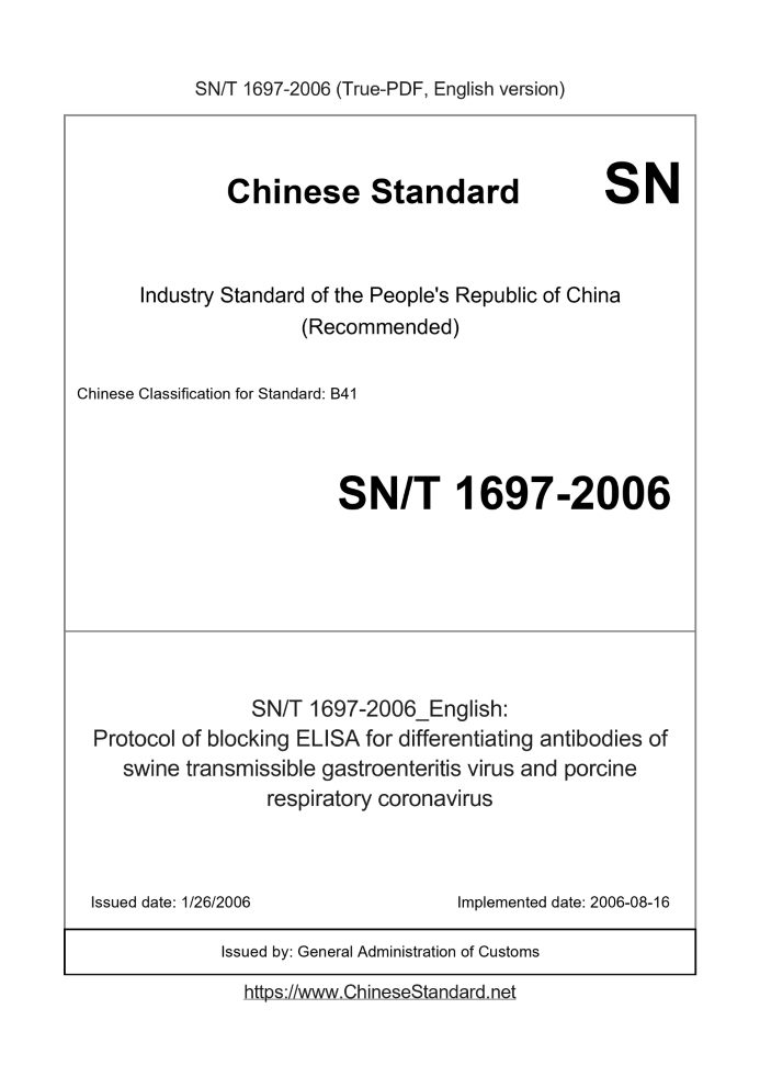 Basic dataStandard ID: SN/T 1697-2006 (SN/T1697-2006)Description (Translated English): Protocol of blocking ELISA for differentiating antibodies of swine transmissible gastroenteritis virus and porcine respiratory coronavirus Sector / Industry: Commodity Inspection Standard (Recommended) Classification of Chinese Standard: B41 Classification of International Standard: 11.220 Word Count Estimation: 6,675 Date of Issue: 1/26/2006 Date of Implementation: 2006-08-16 Quoted Standard: GB/T 6682 Regulation (derived from): ?Industry Standard Announcement 2006 No.4 (Total No.76); National-Quality-Inspection-accreditation (2010) 290; Industry Standard Filing Announcement 2010 No.10 (Total No.130) Issuing agency(ies): General Administration of Customs Summary: This standard specifies the porcine transmissible gastroenteritis (TGE) virus blocking ELISA antibody identification test operations technical requirements. This standard applies to porcine transmissible gastroenteritis virus, porcine respiratory coronavirus identified. SN/T 1697-2006: Protocol of blocking ELISA for differentiating antibodies of swine transmissible gastroenteritis virus and porcine respiratory coronavirus---This is a DRAFT version for illustration, not a final translation. Full copy of true-PDF in English version (including equations, symbols, images, flow-chart, tables, and figures etc.) will be manually/carefully translated upon your order. Protocol of blocking ELISA for differentiating antibodies of swine transmissible gastroenteritis virus and porcine respiratory coronavirus People's Republic of China Entry-Exit Inspection and Quarantine Industry Standard Porcine transmissible gastroenteritis virus and porcine respiratory coronavirus Antibody Blocking ELISA Identification Test Procedure Released on.2006-01-26 Implementation of.2006-08-16 People's Republic The General Administration of Quality Supervision, Inspection and Quarantine issued ForewordAppendix A, Appendix B and Appendix C of this standard are normative appendices. This standard is proposed and managed by the National Certification and Accreditation Administration. This standard was drafted. Guangdong Entry-Exit Inspection and Quarantine Bureau of the People's Republic of China. The main drafters of this standard. Luo Changbao, Chen Ru, Liu Linlin. This standard is the first industry standard for entry-exit inspection and quarantine. Porcine transmissible gastroenteritis virus and porcine respiratory coronavirus Antibody Blocking ELISA Identification Test Procedure1 ScopeThis standard specifies the ELISA test for porcine transmissible gastroenteritis (TGE) virus and porcine respiratory coronary (PRC) virus antibody blocking ELISA. Operational technical requirements. This standard applies to the identification of porcine transmissible gastroenteritis virus and porcine respiratory coronavirus.2 Normative referencesThe terms in the following documents become the terms of this standard by reference to this standard. All dated references, followed by all Modifications (not including errata content) or revisions do not apply to this standard, however, parties to agreements based on this standard are encouraged to study Is it possible to use the latest version of these files? For undated references, the latest edition applies to this standard. GB/T 6682 Analytical laboratory water specifications and experimental methods3 materials3.1 Viruses and cells ST cells were grown in 96-well cell culture plates to form a monolayer and infected with the TGE virus Miller6 strain. Cytopathic rate after 24h Fix cells at no more than 10%. 3.2 Fixed cells The cell plate was washed once with PBS (pH 7.4) for 1 to 2 times, then fixed with 80% acetone (precooled -20 ° C) for 15 min, and the acetone was discarded. Dry in a wind cabinet for 10 min, then store at -20 °C for later use. 3.3 antibody Biotinylated anti-TGE virus, A site monoclonal antibody, anti-TGE virus D site monoclonal antibody.4 method of operation4.1 Remove the plate from -20 °C and set at room temperature. After blocking the non-specific site for 2 h at room temperature (about 25 °C) with PBST (see Appendix A), remove it. PBST was patted dry on a paper towel and 150 μL of PBST was added to all virus-infected wells. 4.2 Add 50 μL of positive serum to A1 and A2, negative serum B1 and B2 (ie, double well), and other tested serums are listed in Appendix B. 4.3 Dilute the sample cell plate at 4 ° C overnight. 4.4 Drain the diluted sample solution and do not rinse. 4.5 Add 100 μL of working concentration biotinylated TGEA site monoclonal antibody to each well. 4.6 For identification purposes, each sample is diluted in two plates, each plate should be operated separately, using different monoclonal antibodies, separate Count, and contain their respective negative and positive serum. 4.7 At room temperature for 2 h or 4 ° C overnight. 4.8 Wash three times with PBST. 4.9 Add 100 μL of working concentration horseradish peroxidase-labeled avidin to each well and incubate for 30 min to 40 min at room temperature. 4.10 Wash PBST three times. 4.11 Add 100μLABTS to each well (see Appendix C). 4.12 After 30 min at room temperature, 100 μL of sodium 5% sodium dodecyl sulfate (mass concentration) was added to stop the reaction. ......Tips & Frequently Asked Questions:Question 1: How long will the true-PDF of SN/T 1697-2006_English be delivered?Answer: Upon your order, we will start to translate SN/T 1697-2006_English as soon as possible, and keep you informed of the progress. The lead time is typically in 9 seconds (download/delivered in 9 seconds). The lengthier the document the longer the lead time.Question 2: Can I share the purchased PDF of SN/T 1697-2006_English with my colleagues?Answer: Yes. The purchased PDF of SN/T 1697-2006_English will be deemed to be sold to your employer/organization who actually pays for it, including your colleagues and your employer's intranet.Question 3: Does the price include tax/VAT?Answer: 