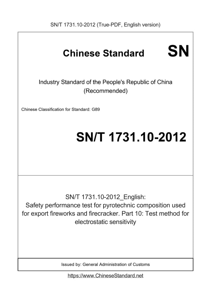 Delivery: <= 3 days. True-PDF full-copy in English will be manually translated and delivered via email. SN/T 1731.10-2012: Safety performance test for pyrotechnic composition used for export fireworks and firecracker. Part 10: Test method for electrostatic sensitivity Status: Valid