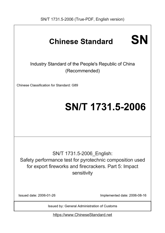 Delivery: <= 3 days. True-PDF full-copy in English will be manually translated and delivered via email. SN/T 1731.5-2006: Safety performance test for pyrotechnic composition used for export fireworks and firecrackers. Part 5: Impact sensitivity Status: Valid