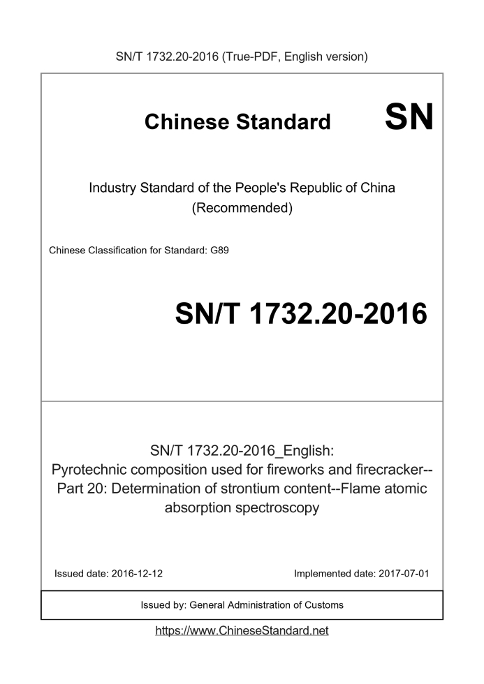 Delivery: <= 3 days. True-PDF full-copy in English will be manually translated and delivered via email. SN/T 1732.20-2016: Pyrotechnic composition used for fireworks and firecracker--Part 20: Determination of strontium content--Flame atomic absorption spectroscopy Status: Valid