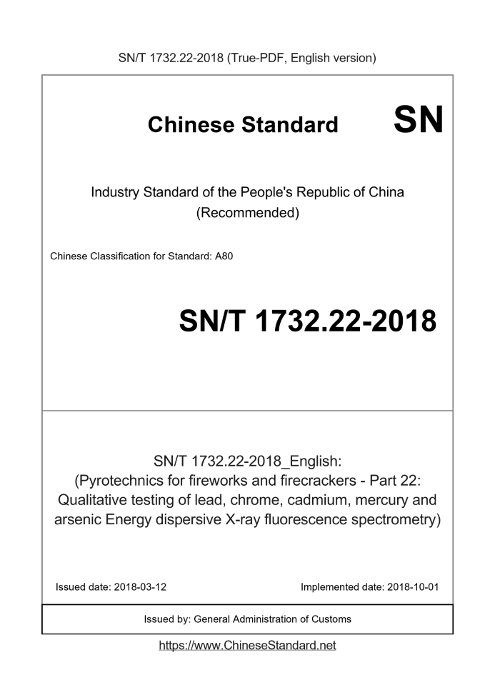 Basic dataStandard ID: SN/T 1732.22-2018 (SN/T1732.22-2018)Description (Translated English): (Pyrotechnics for fireworks and firecrackers - Part 22: Qualitative testing of lead, chrome, cadmium, mercury and arsenic Energy dispersive X-ray fluorescence spectrometry) Sector / Industry: Commodity Inspection Standard (Recommended) Classification of Chinese Standard: A80 Date of Issue: 2018-03-12 Date of Implementation: 2018-10-01 Regulation (derived from): National Quality Inspection Letter (2018) No.76 Issuing agency(ies): General Administration of Customs Tips & Frequently Asked Questions:Question 1: How long will the true-PDF of SN/T 1732.22-2018_English be delivered?Answer: Upon your order, we will start to translate SN/T 1732.22-2018_English as soon as possible, and keep you informed of the progress. The lead time is typically 1 ~ 3 working days. The lengthier the document the longer the lead time.Question 2: Can I share the purchased PDF of SN/T 1732.22-2018_English with my colleagues?Answer: Yes. The purchased PDF of SN/T 1732.22-2018_English will be deemed to be sold to your employer/organization who actually pays for it, including your colleagues and your employer's intranet.Question 3: Does the price include tax/VAT?Answer: Yes. Our tax invoice, downloaded/delivered in 9 seconds, includes all tax/VAT and complies with 100+ countries' tax regulations (tax exempted in 100+ countries) -- See Avoidance of Double Taxation Agreements (DTAs): List of DTAs signed between Singapore and 100+ countriesQuestion 4: Do you accept my currency other than USD?Answer: Yes. If you need your currency to be printed on the invoice, please write an email to Sales@ChineseStandard.net. In 2 working-hours, we will create a special link for you to pay in any currencies. Otherwise, follow the normal steps: Add to Cart -- Checkout -- Select your currency to pay. |