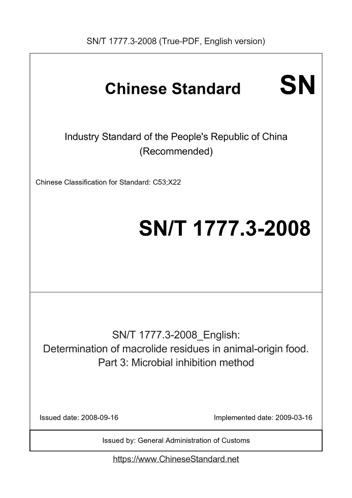 Delivery: <= 3 days. True-PDF full-copy in English will be manually translated and delivered via email. SN/T 1777.3-2008: Determination of macrolide residues in animal-origin food. Part 3: Microbial inhibition method Status: Valid