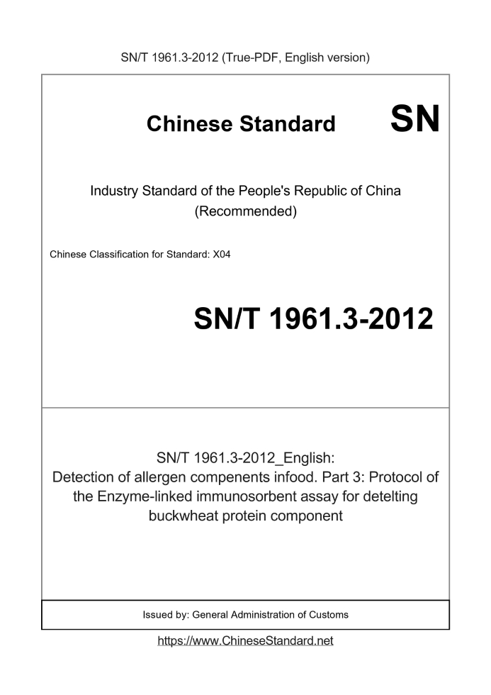| SN/T 1961.3-2012 English PDFUS$209.00 ยท In stock Delivery: <= 3 days. True-PDF full-copy in English will be manually translated and delivered via email. SN/T 1961.3-2012: Detection of allergen compenents infood. Part 3: Protocol of the Enzyme-linked immunosorbent assay for detelting buckwheat protein component Status: Valid