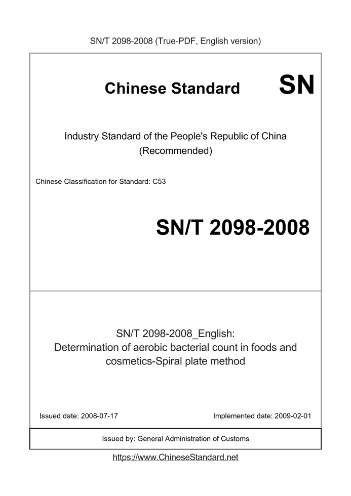 Delivery: <= 3 days. True-PDF full-copy in English will be manually translated and delivered via email. SN/T 2098-2008: Determination of aerobic bacterial count in foods and cosmetics-Spiral plate method Status: Valid