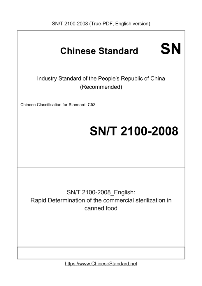 Delivery: <= 3 days. True-PDF full-copy in English will be manually translated and delivered via email. SN/T 2100-2008: Rapid Determination of the commercial sterilization in canned food Status: Valid